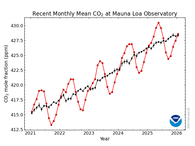 Atmospheric carbon dioxide concentrations on May 1, 2025, 430.82 ppm. Compare with May 1, 2024, 426.34 ppm.