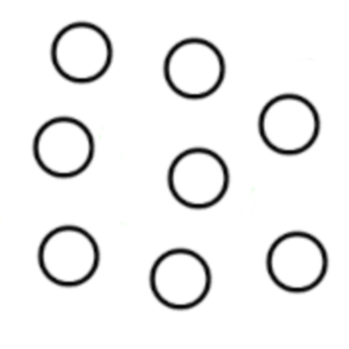 Our guidance comes from thermodynamics which uses the counting numbers and their extension to the real numbers. Here entropy is a function of the number and distribution of particles and their energies. It is a measure of the energy that is not useable and is wasted as heat in any real chemical reaction. For example consider a collection of particles (identities, self relational systems). Their number and distribution provides a measure of thermodynamic entropy for a real world collection of particles. The following diagram shows a collection of eight particles.