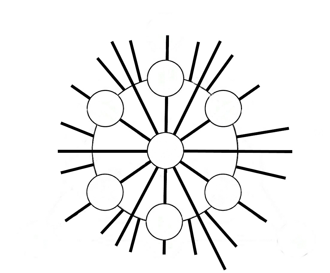 There are 24 spokes radiating out of this diagram. If the spokes are arrows pointing out the diagram represents everything, God. If the spokes are arrows pointing in, the diagram represents the collapse of everything into a point, a self, me or you in the universe.
