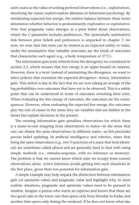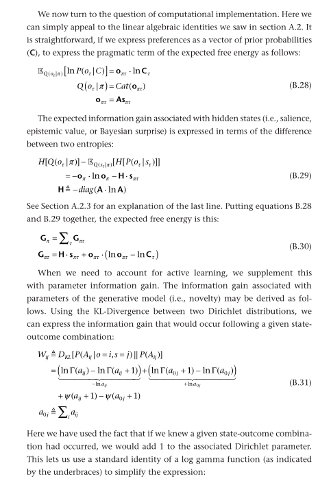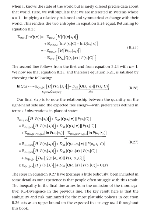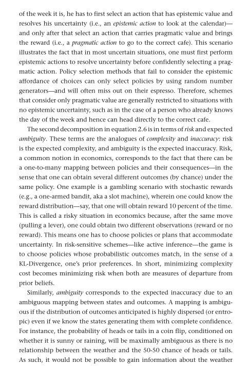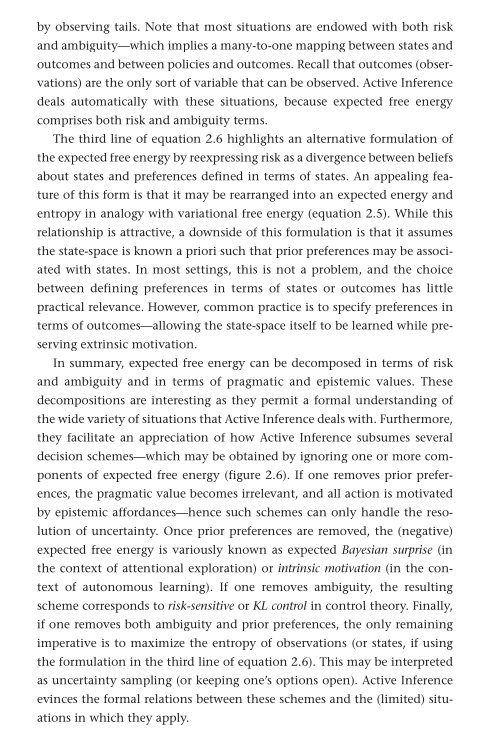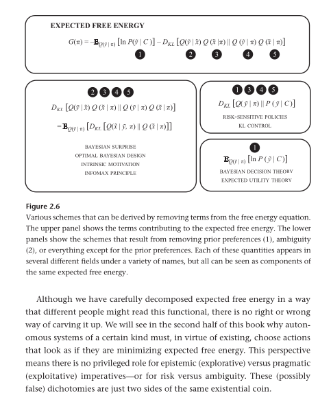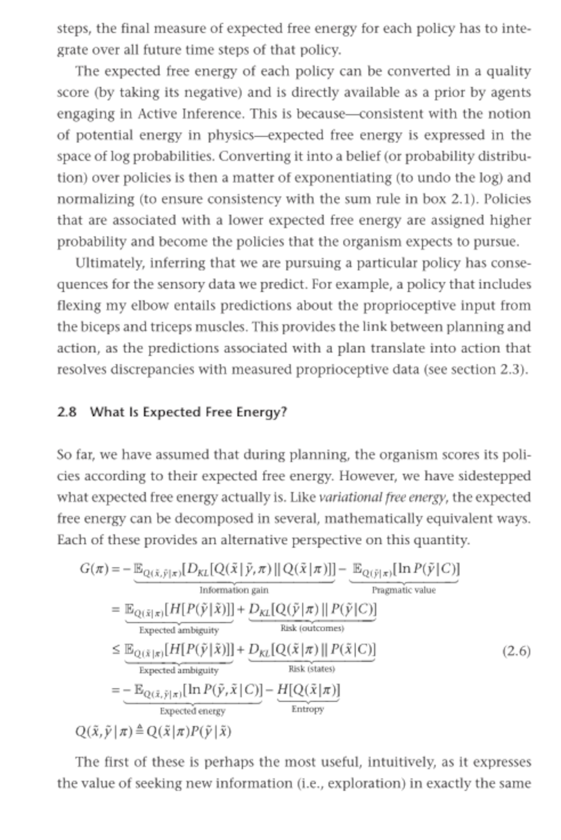 {$G(\pi) = E_{Q(\tilde{x}|\pi)}[H[P(\tilde{y}|\tilde{x})]] + D_{KL}[Q(\tilde{y}|\pi)\parallel P(\tilde{y}|C)]$} | plus expected ambiguity plus risk (outcomes) |