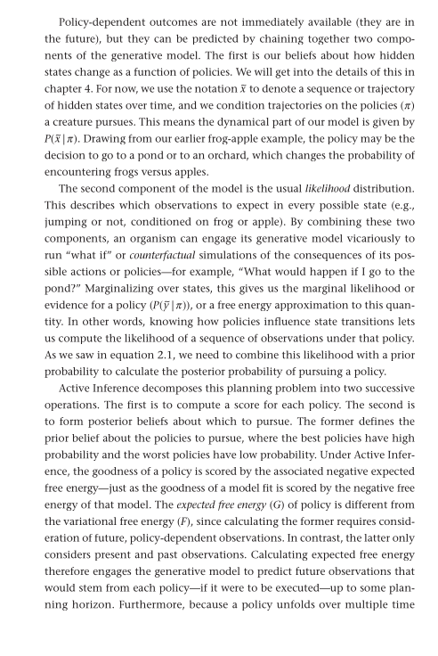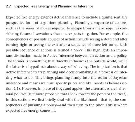 - compose a score for each policy: define the prior beliefs about policies, where best policies have high probability (score with the negative expected free energy)(this is the logarithm of a probability, which is comparable to how potential energy is written)