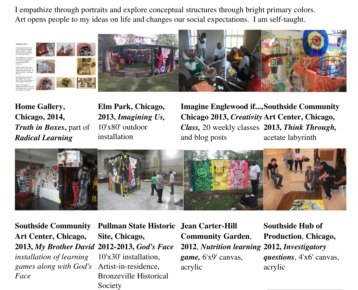 A video self-portrait of myself as an artist-activist-educator-organizer that I made in 2012. I present my art exhibit at the Southside Community Art Center in Chicago along with my plan to create learning canvases for the Englewood neighborhood.