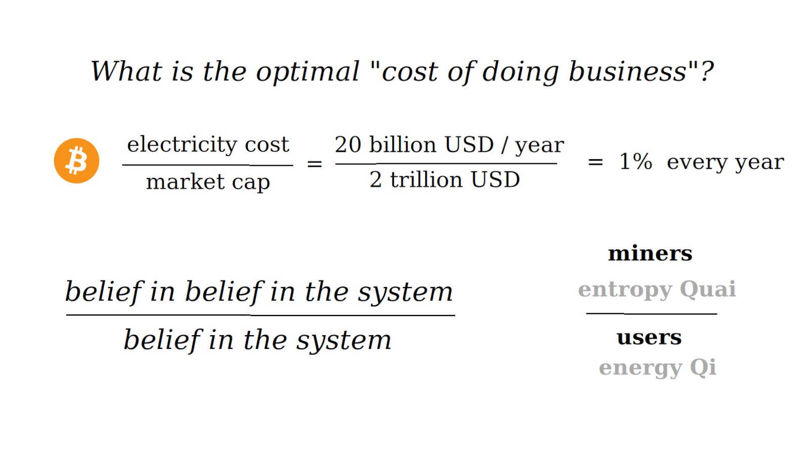 - The cost of doing business for an economy is the incentive for the power structure, the organizers and maintainers. Then the entropy is the cost of mining and the free energy is the ability to support transactions that allow individuals to do their thing.