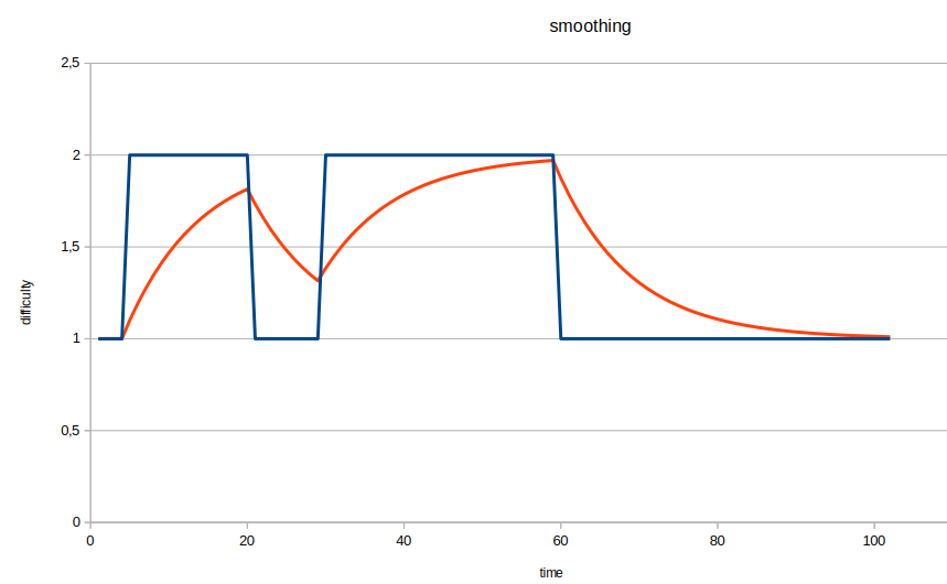 The graph of how the averaging works. Smoothing the blue curve yields the red curve.