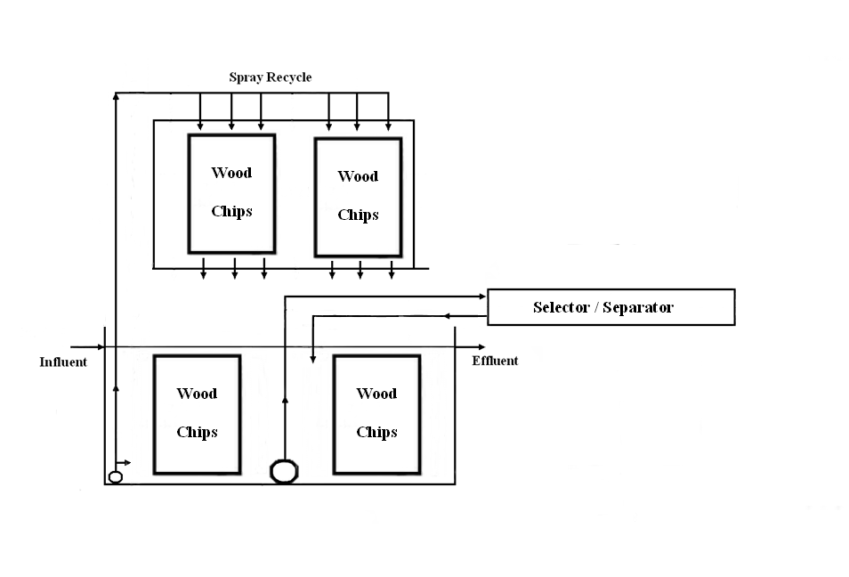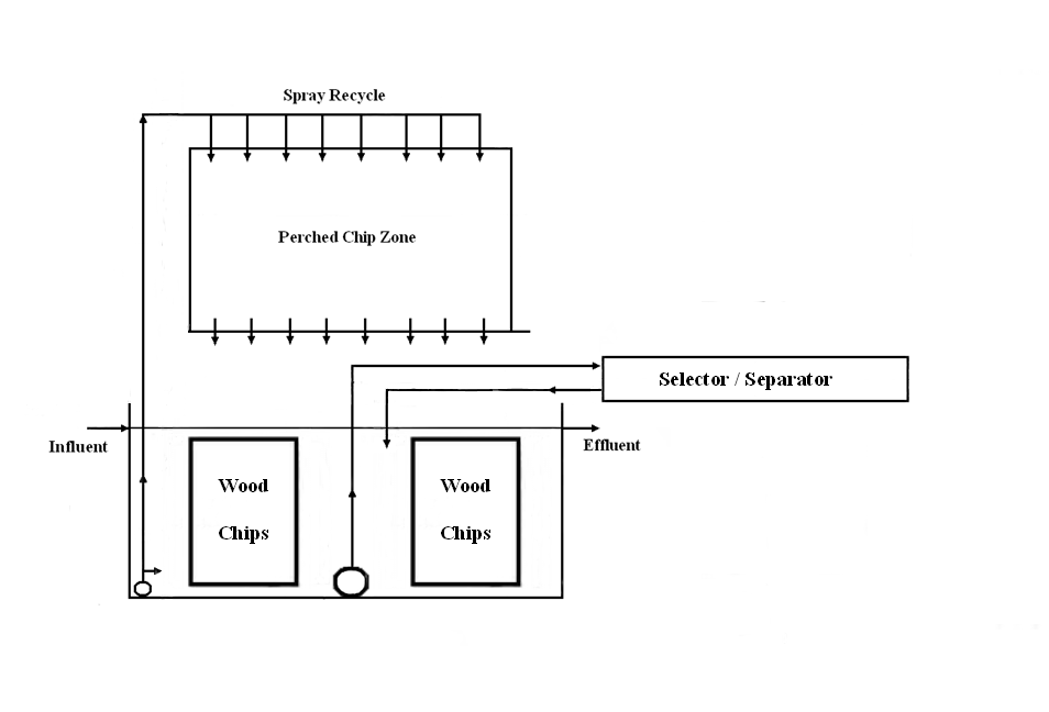 Harvesting the wood chips will be done in a manner that removes all invertebrates and most of the microbial biomass from the residual wood chip. Some of the microbes will stay attached to the harvested chip and some of them will be settled out with the small particle fragments and collected in the solids selector/separator.