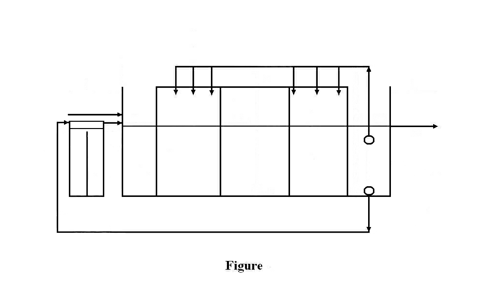 Water will enter an influent water zone, pass through a first sapling crate into a second water zone, then through a second sapling crate into an effluent water zone, from which it will be discharged. A recycle pump will pump water and settled solids from the bottom center of the effluent water zone and will distribute this to the tops of the two sapling crates. The following drawing presents a diagram of side view of this system.