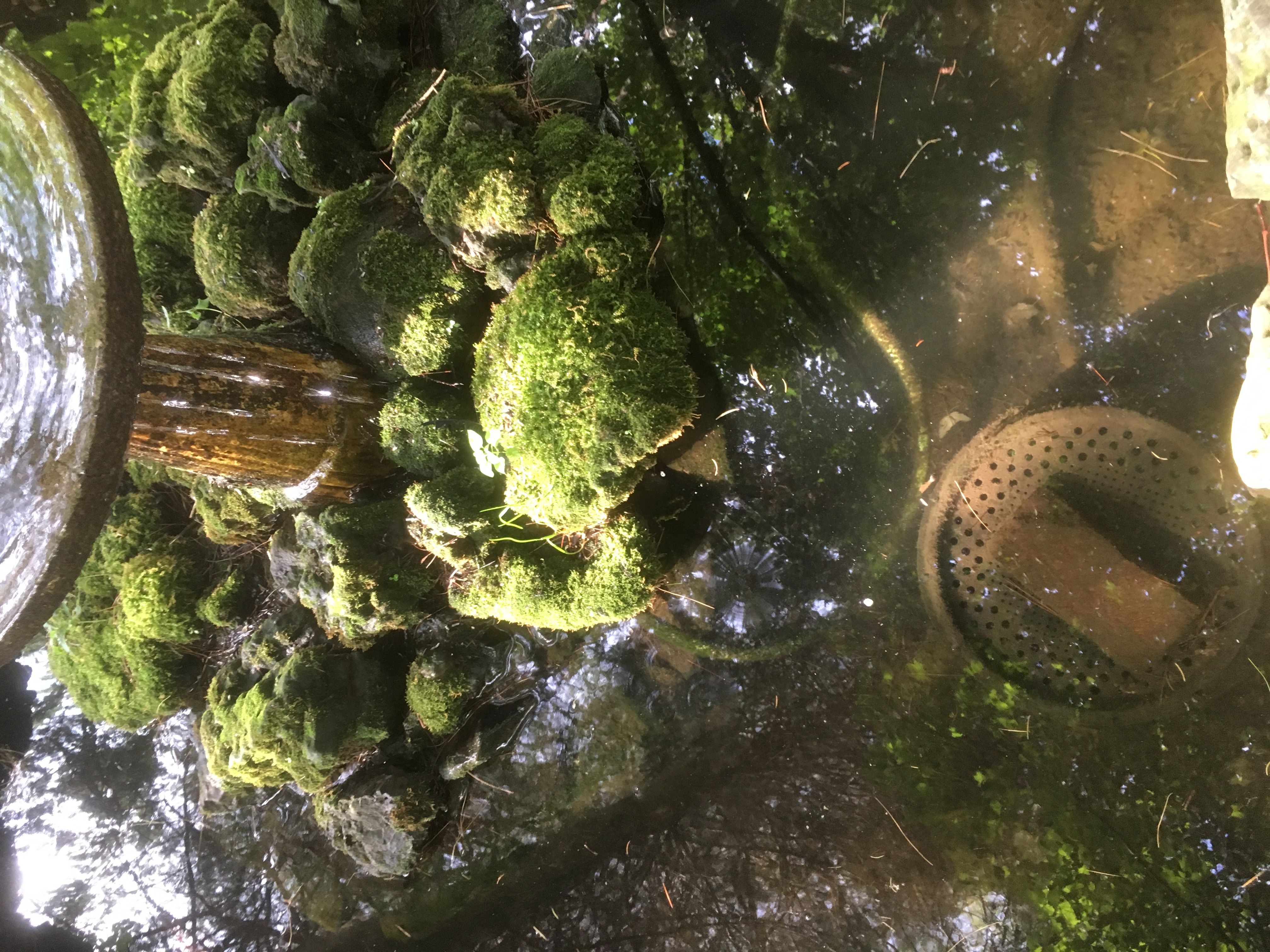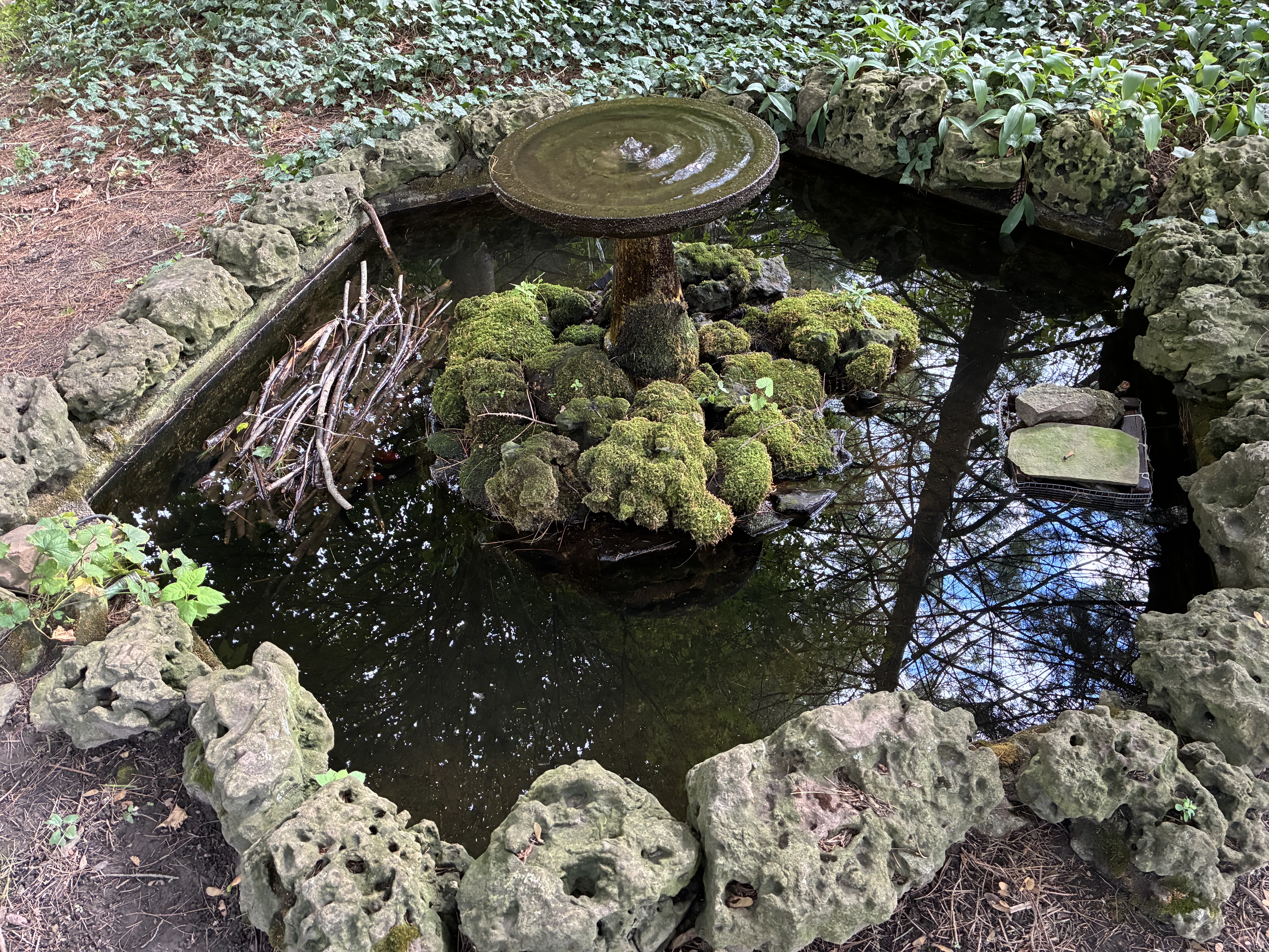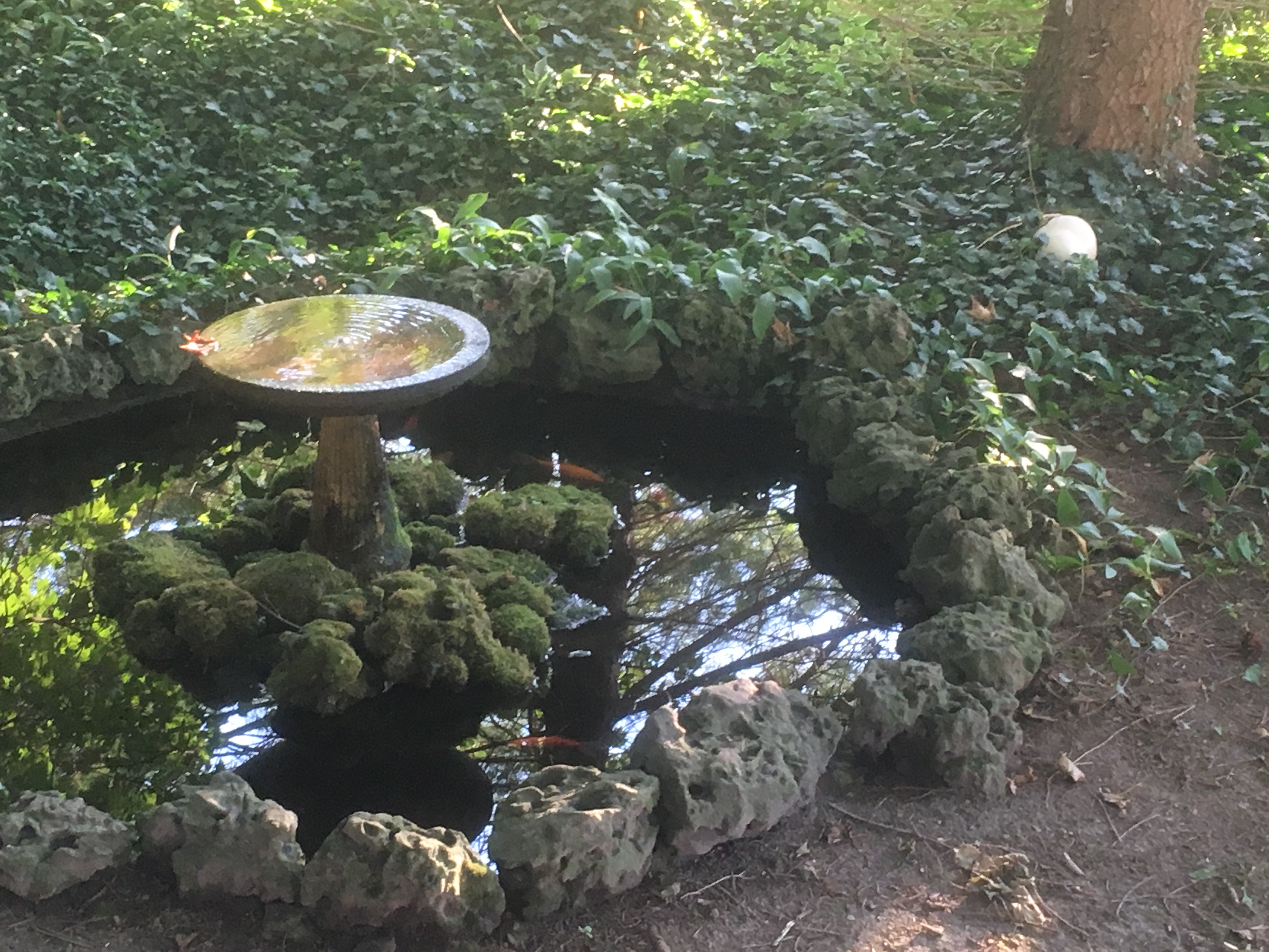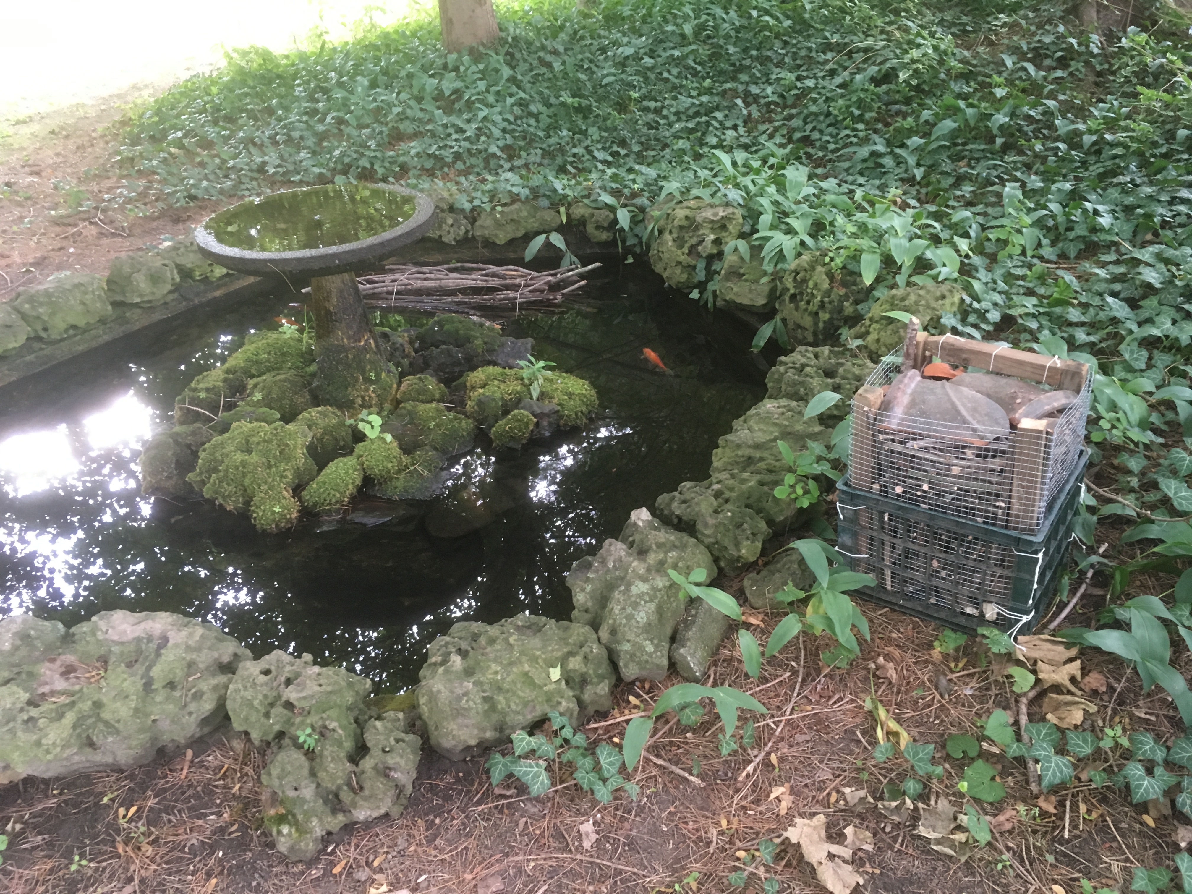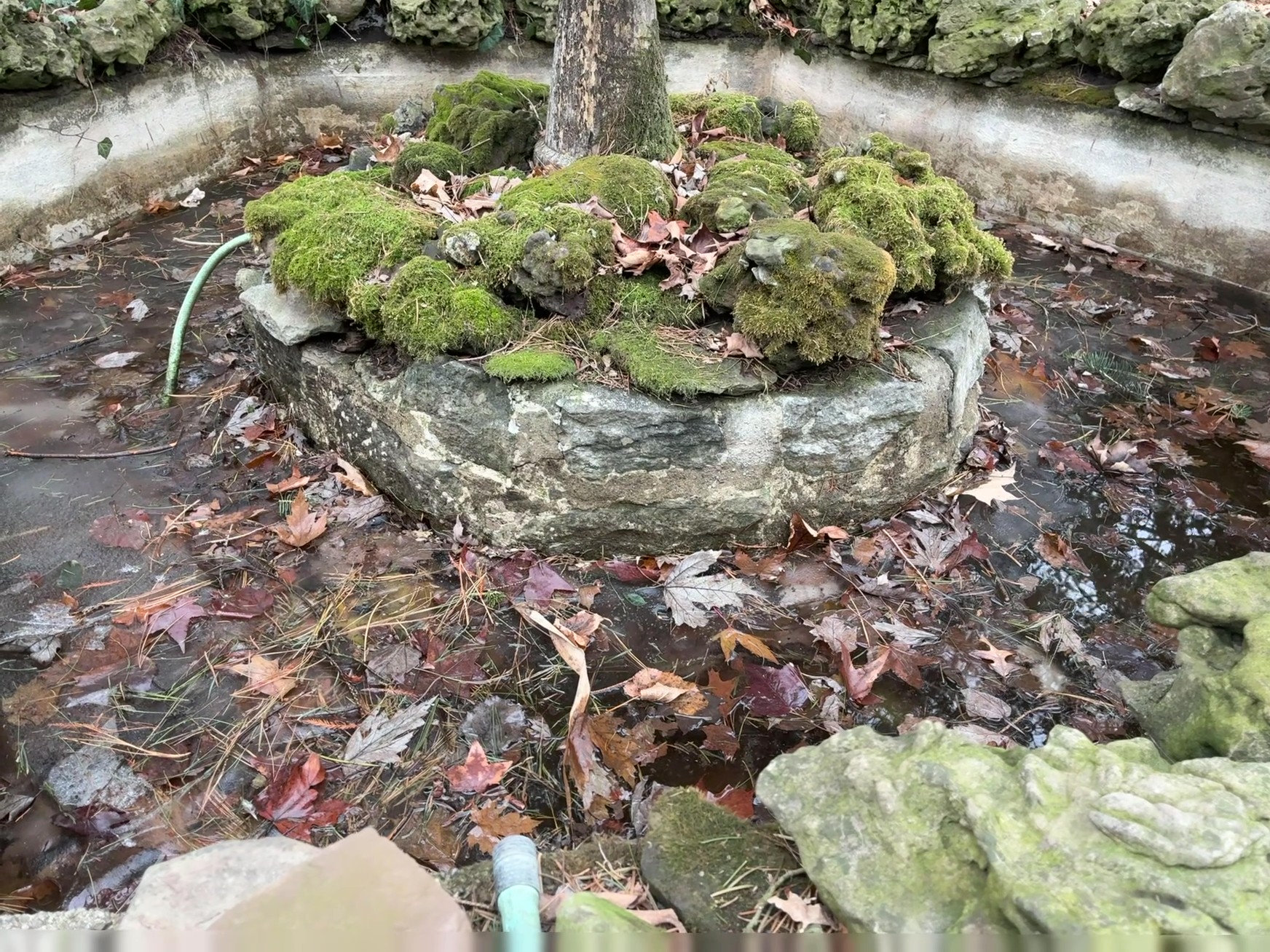 The backyard pond comprises an eight foot diameter hexagonal concrete tank that holds about 400 gallons with a water depth of 18 inches. There is a three foot diameter center island that supports a bird bath and some moss covered rocks. Water is pumped from the pond, up though the birdbath pedestal, and into the center of the birdbath, where it functions as a fountain that spills over the edge, onto the moss and rocks below, and then seeps back into the pond. Here are photos showing the pond in summer and when most of the water is removed for winter. This shows the detail of the center island.