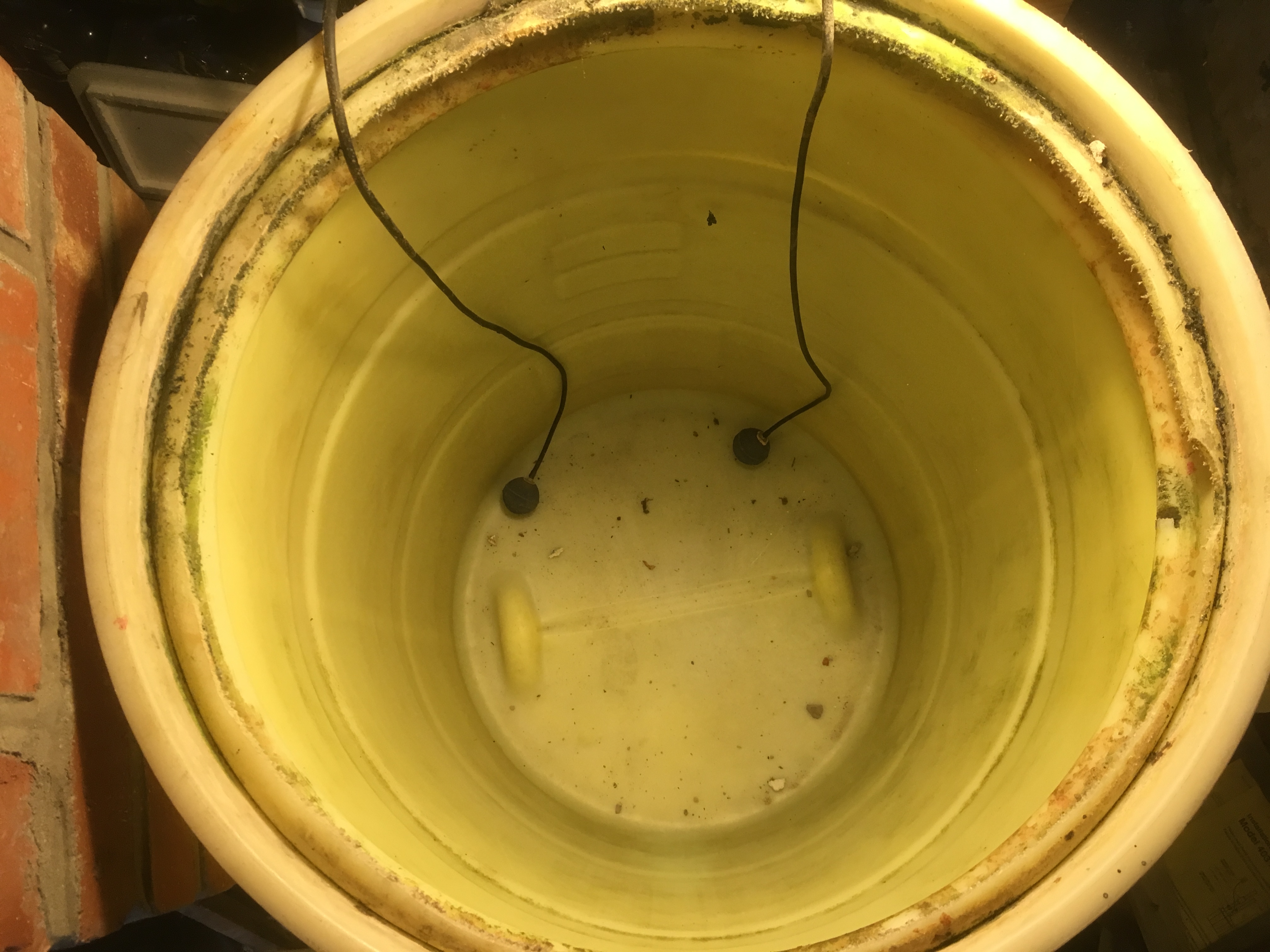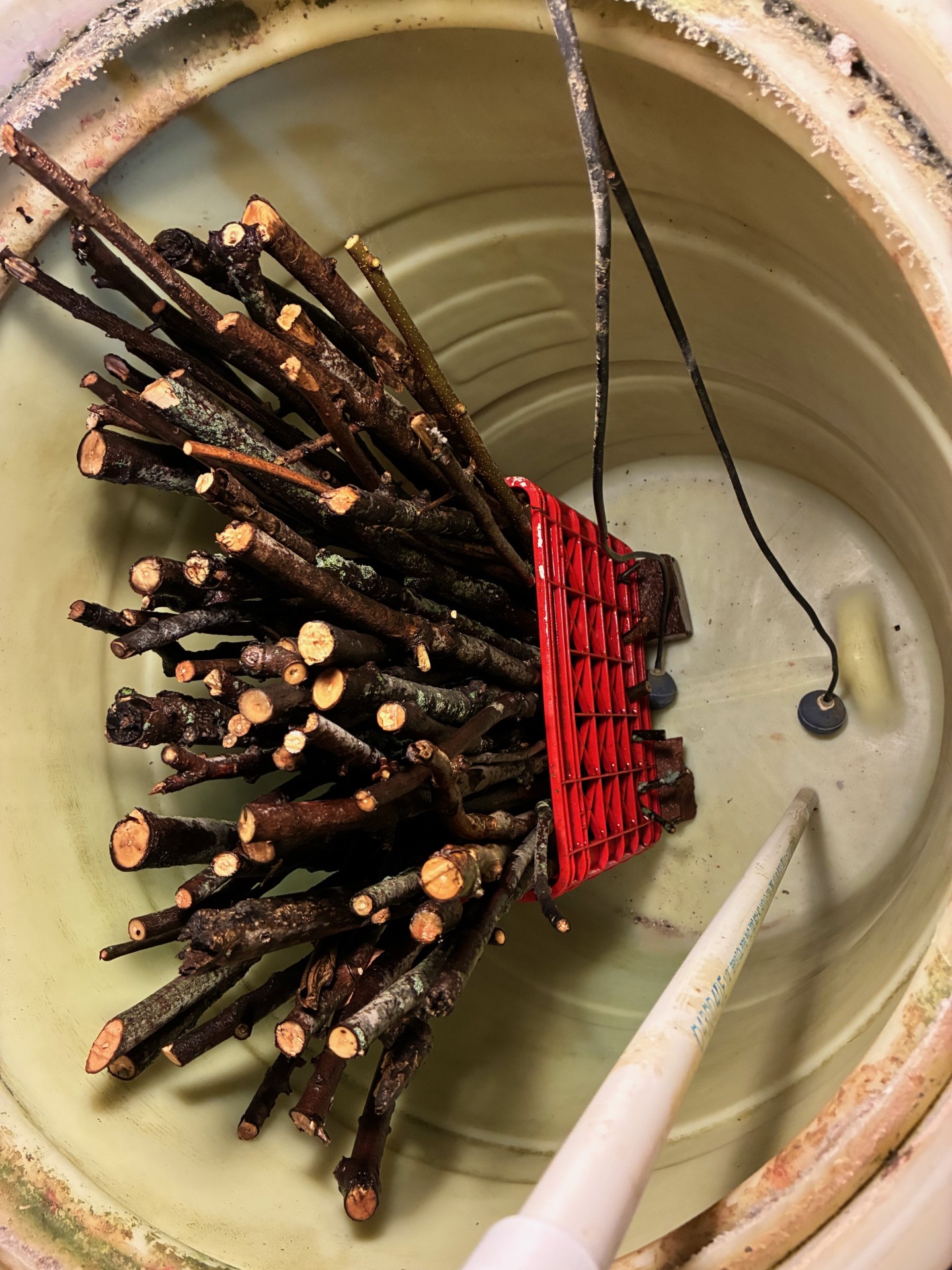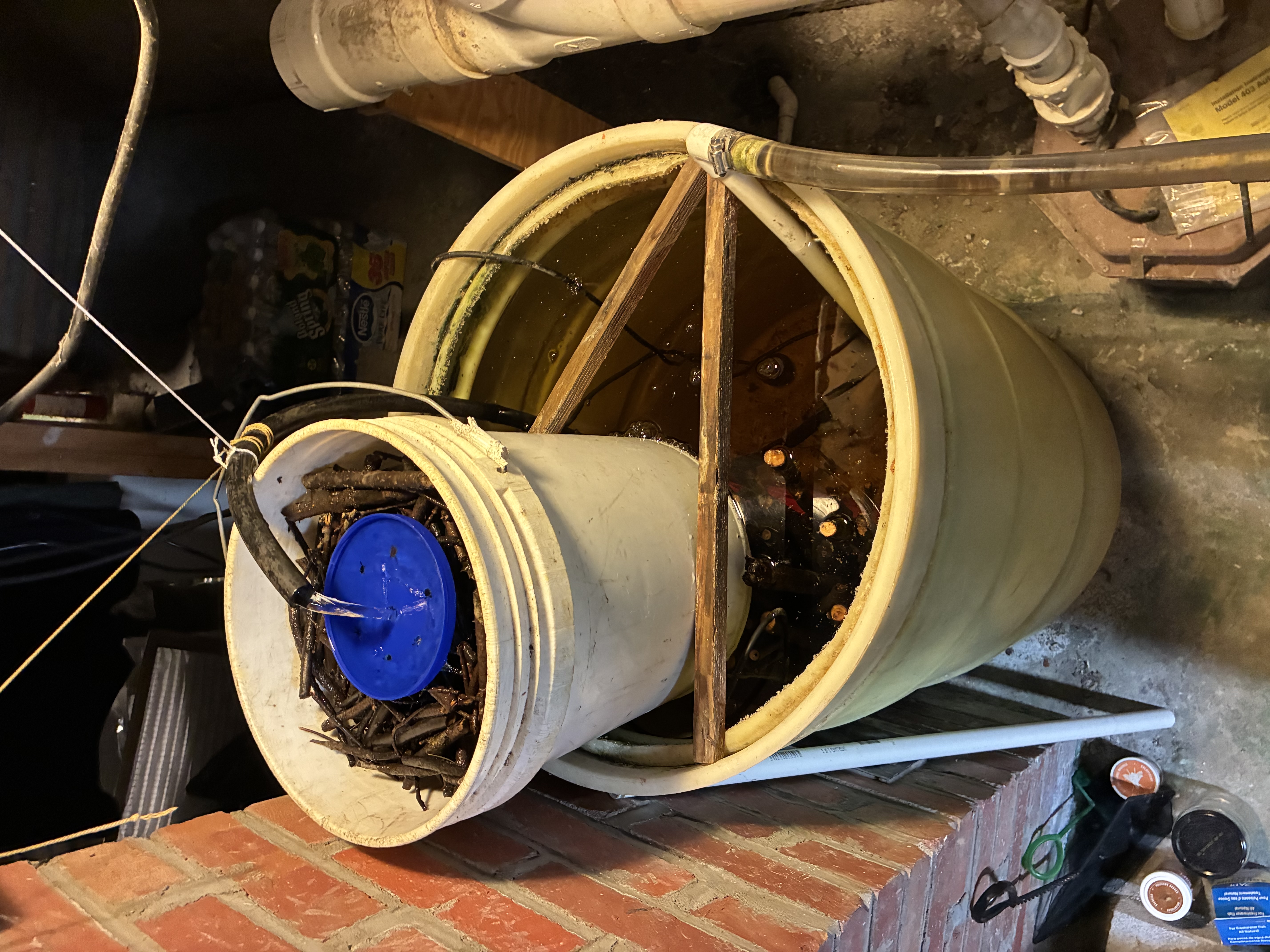 The stick milk crate unit was placed on two bricks so that an airstone could be placed under the milk crate. A five gallon pail was then filled with the sticks from the milk crate system from the pond. Holes were drilled in the bottom of the five gallon pail so that water could flow through the short sticks in the pail, and then flow out of the pail onto the larger stick system that was submerged in the 55 gallon drum. The five gallon pail was placed above the water line in the 55 gallon drum, but still on top of the submerged stick system. This was continuously irrigated with a recycle pump from the bottom of the drum. Here are photos of the pail with holes in the bottom, the pail placed above the submerged stick system in the 55 gallon drum, and the 2 gallon decant pail system inside a wash tub that receives water and solids siphoned from the bottom of the 55 gallon drum. These are subsequently pumped into a septic system.