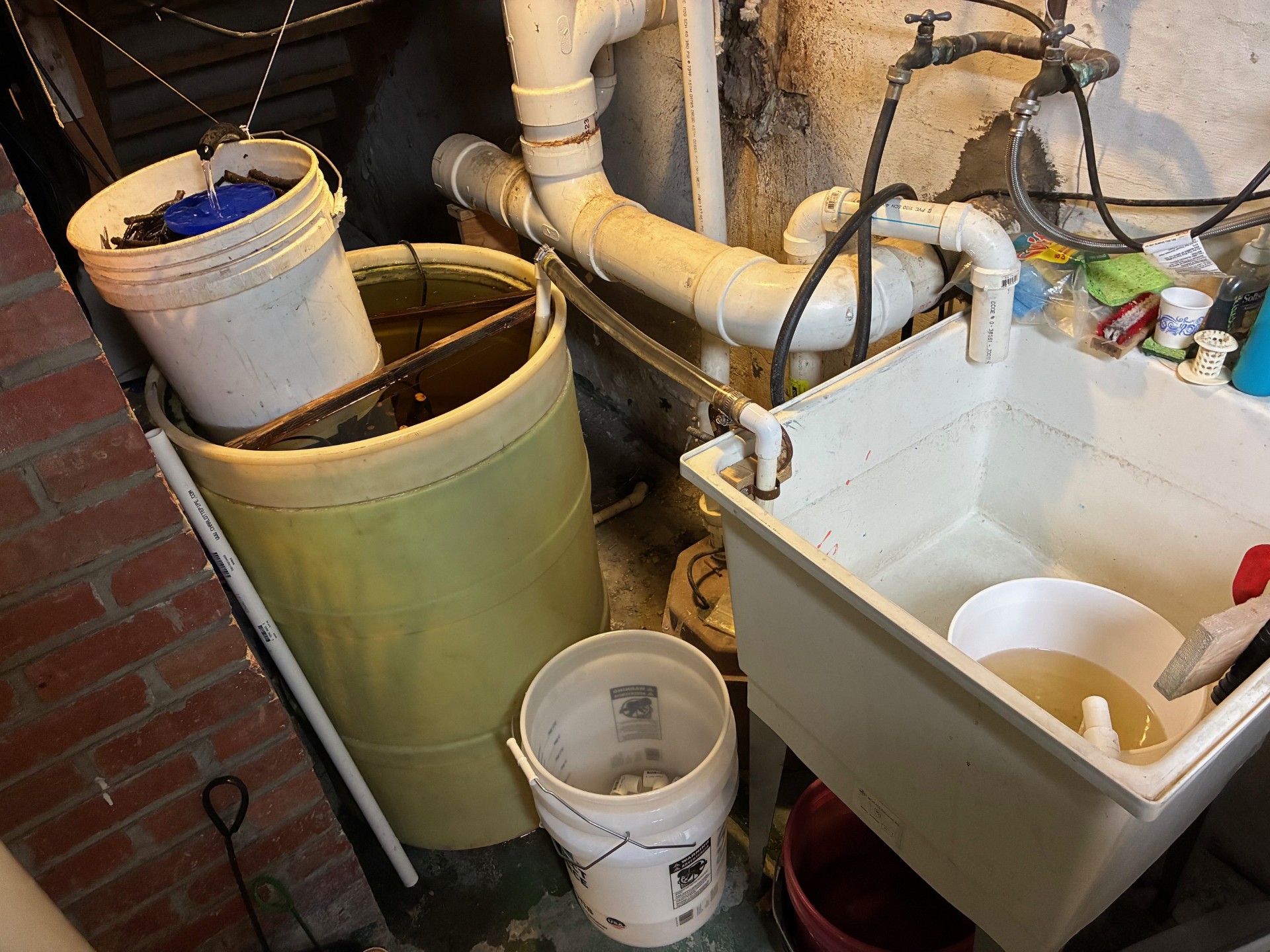 In late October and early November 2025 the basement system was retrofitted to make it consistent with the second generation ecotechnology. As previously described the system had comprised a 55 gallon tank with two small air stones and a small recycle pump and biofilter. About 2 to 5 gallons of water per day would be siphoned off the tank bottom and replaced with tap water. The HRT was thus 10 to 20 days. This included any solid fish wastes that collected there. This water went directly into a wash tub that was pumped into our septic tank. This biolfilter could be replaced or washed every few weeks or so with the collected solids also going into the tub and septic tank.