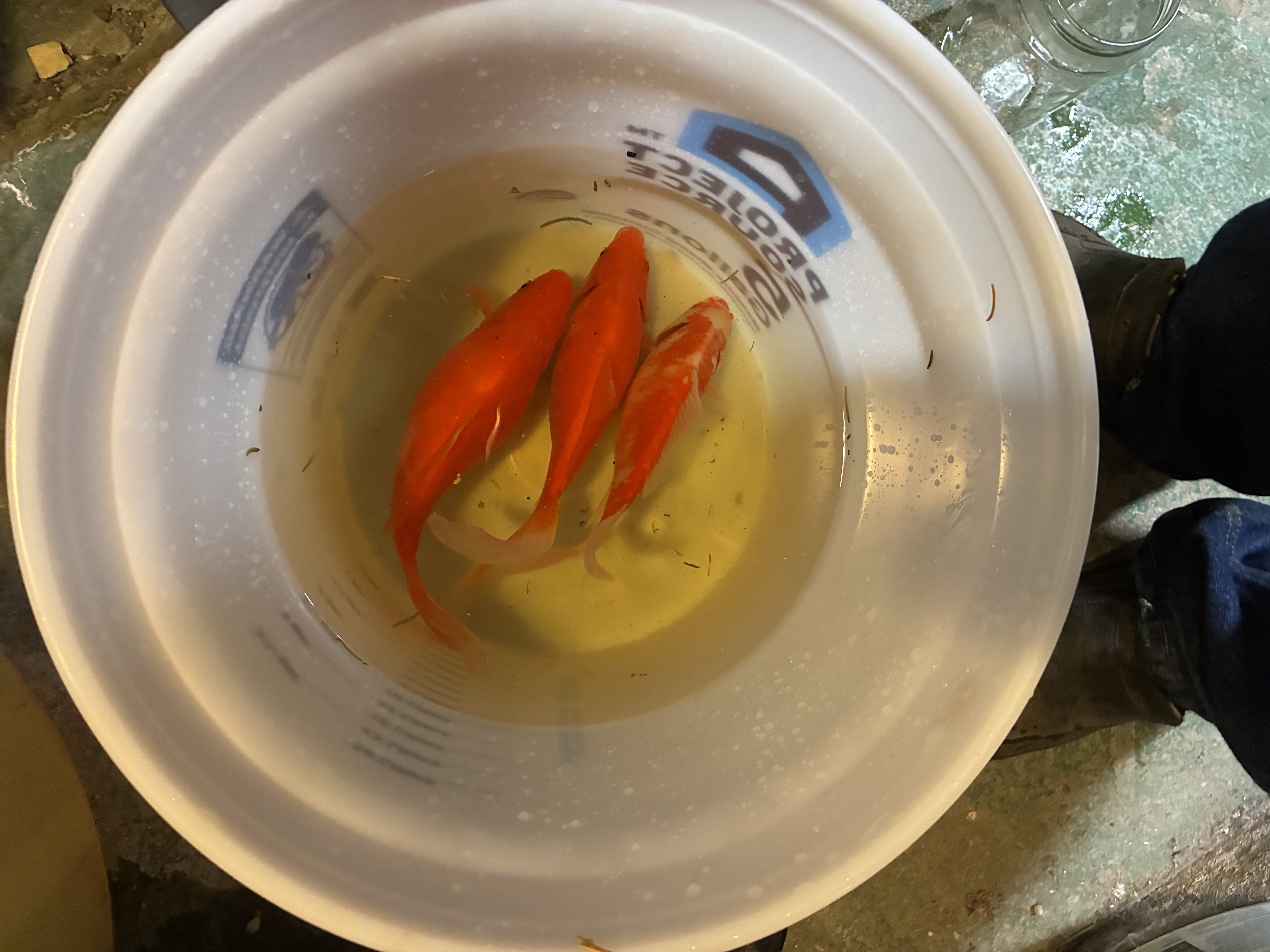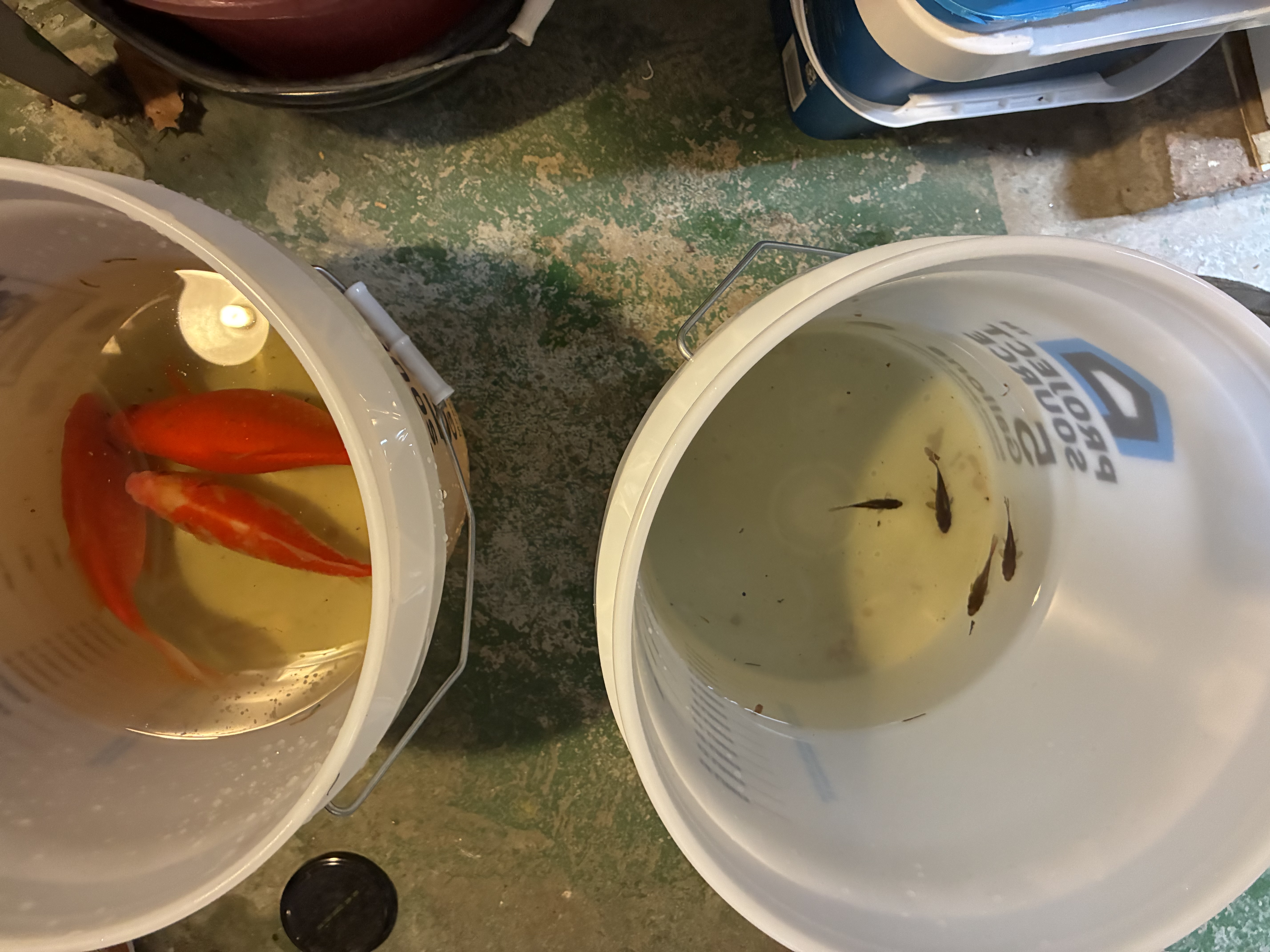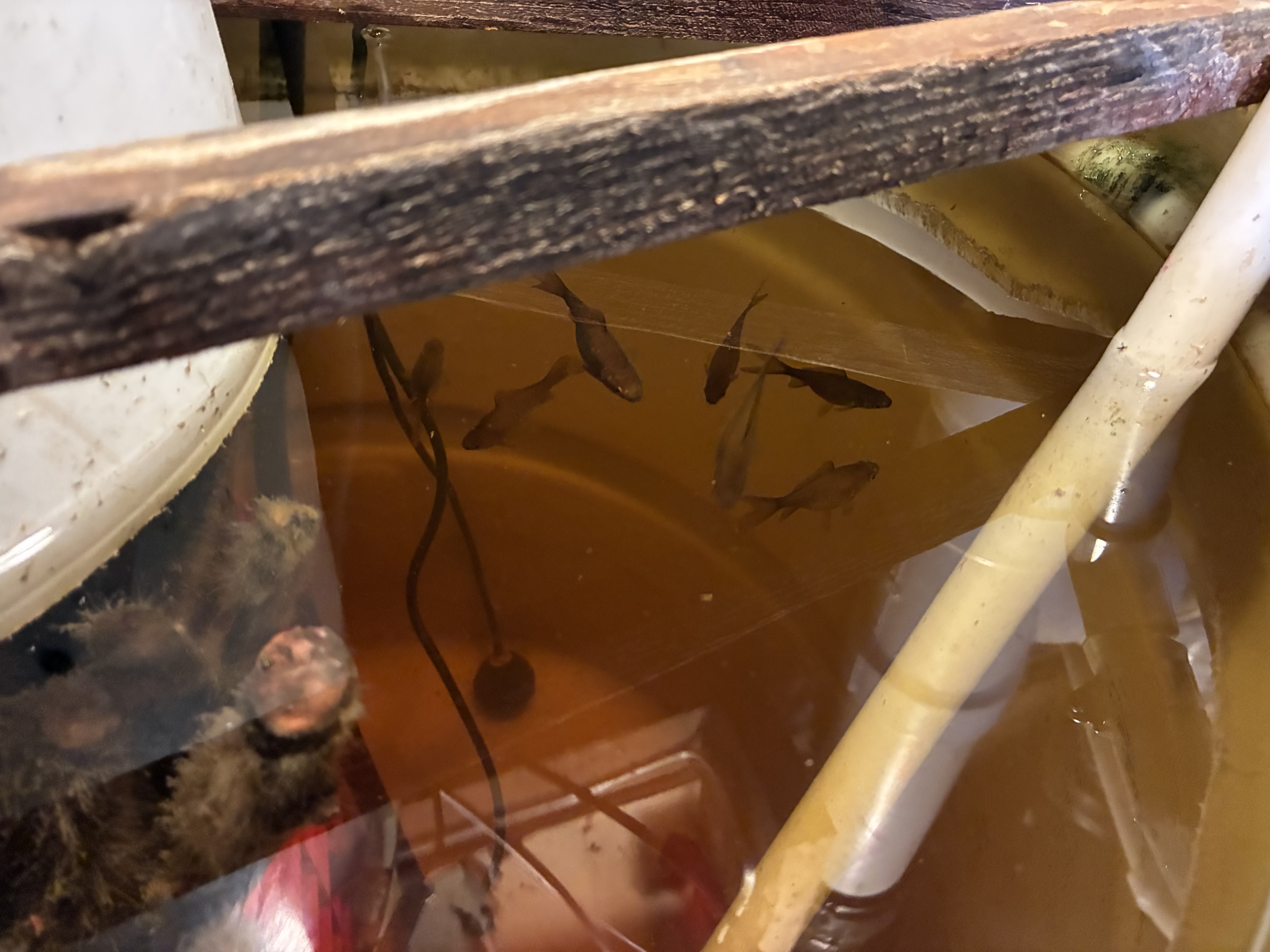 Here is the initial stocking of goldfish from the pond on August 16, 2025. This included three large goldfish that had been in the system for many years. They collectively weighed about 2.5 pounds. They were accompanied by four baby goldfish that were born in the system in early September, 2025. Over the next several weeks 8 more baby goldfish were collected from the pond and introduced into the basement system for a total of 12 new baby goldfish.