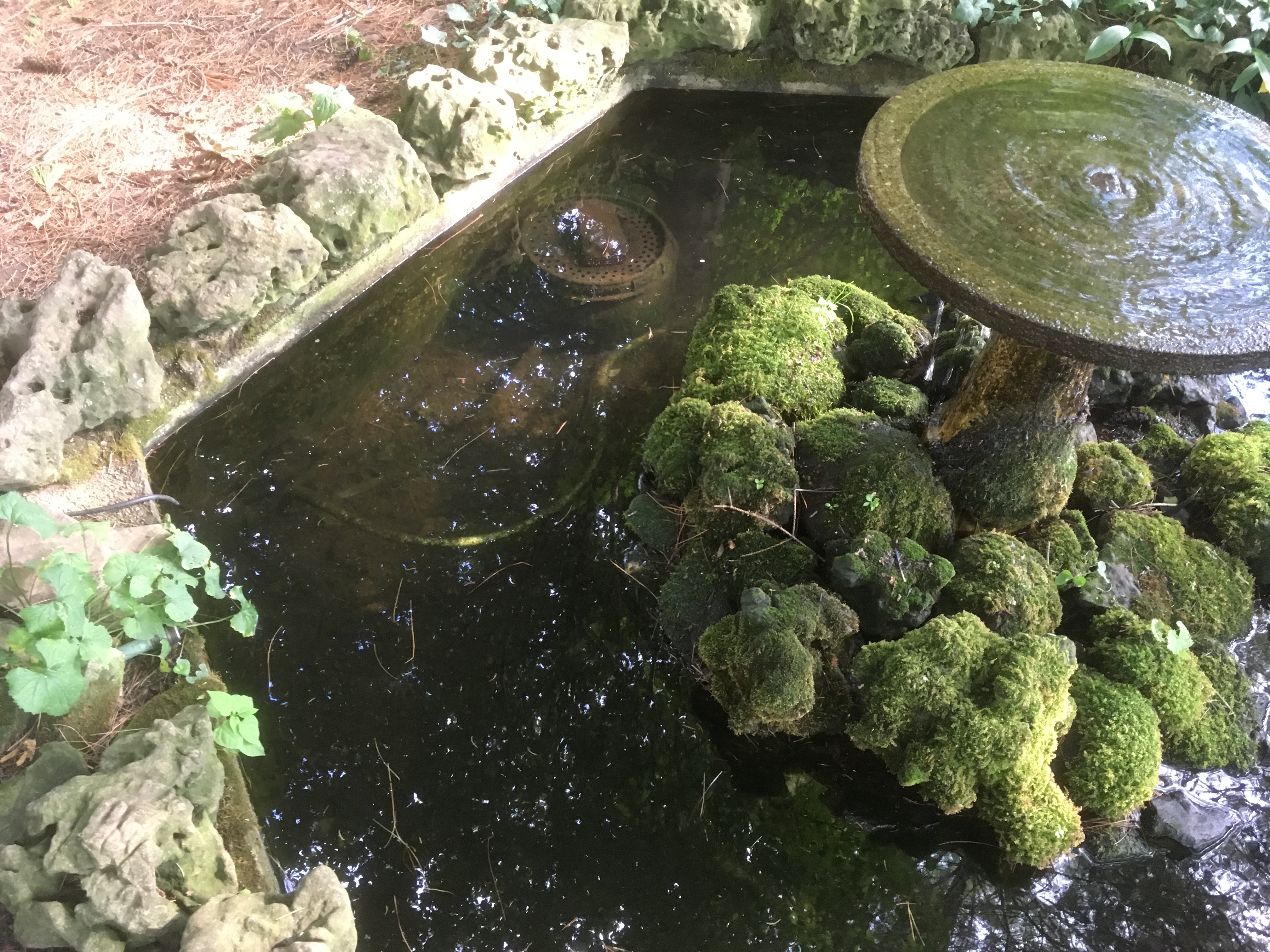 The suction of the recycle pump is attached to a circular biofilter containing a plastic media that traps biosolids. These are periodically removed from the biofilter and deposited on the groundcover near trees on the property. Here are three photos of the pond and the birdbath fountain and biofilter.