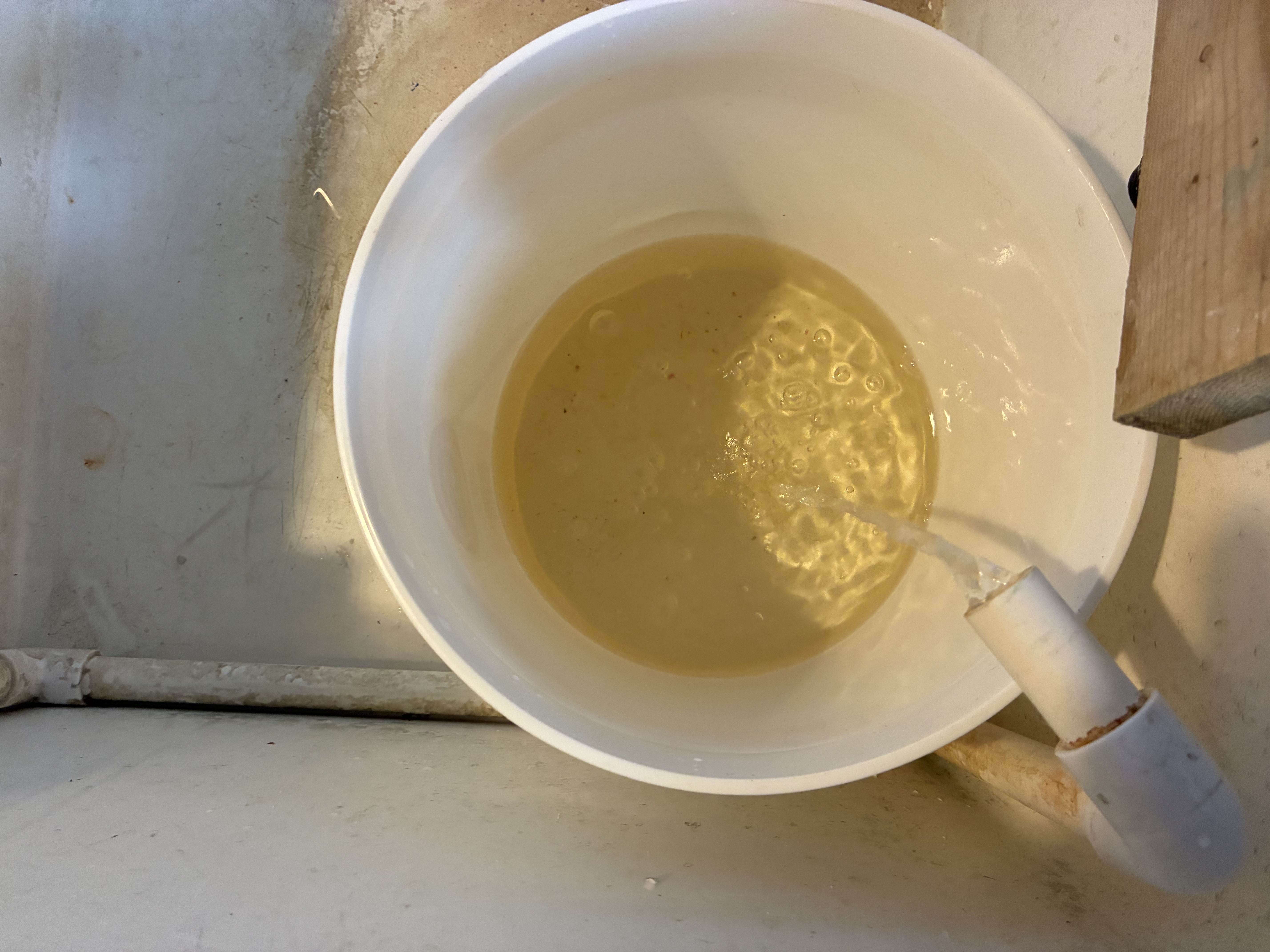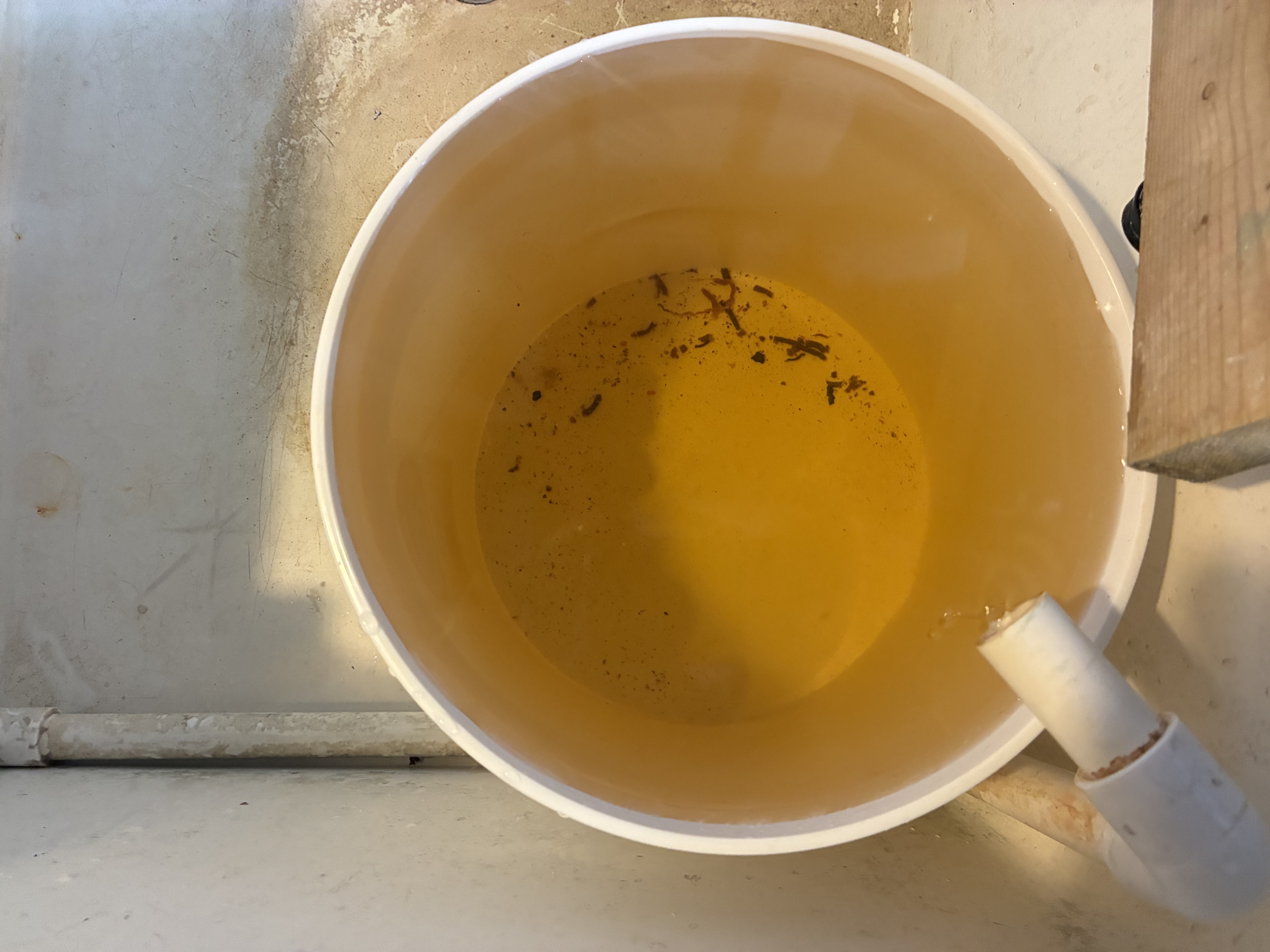 Here are photos of the decant pail being filled by the siphon; the decant pail and collected wastes, biomass, and wood fragments after the siphon is finished; and the decant pail after almost all of the water has been emptied with only the solids and about two cups of water remaining.