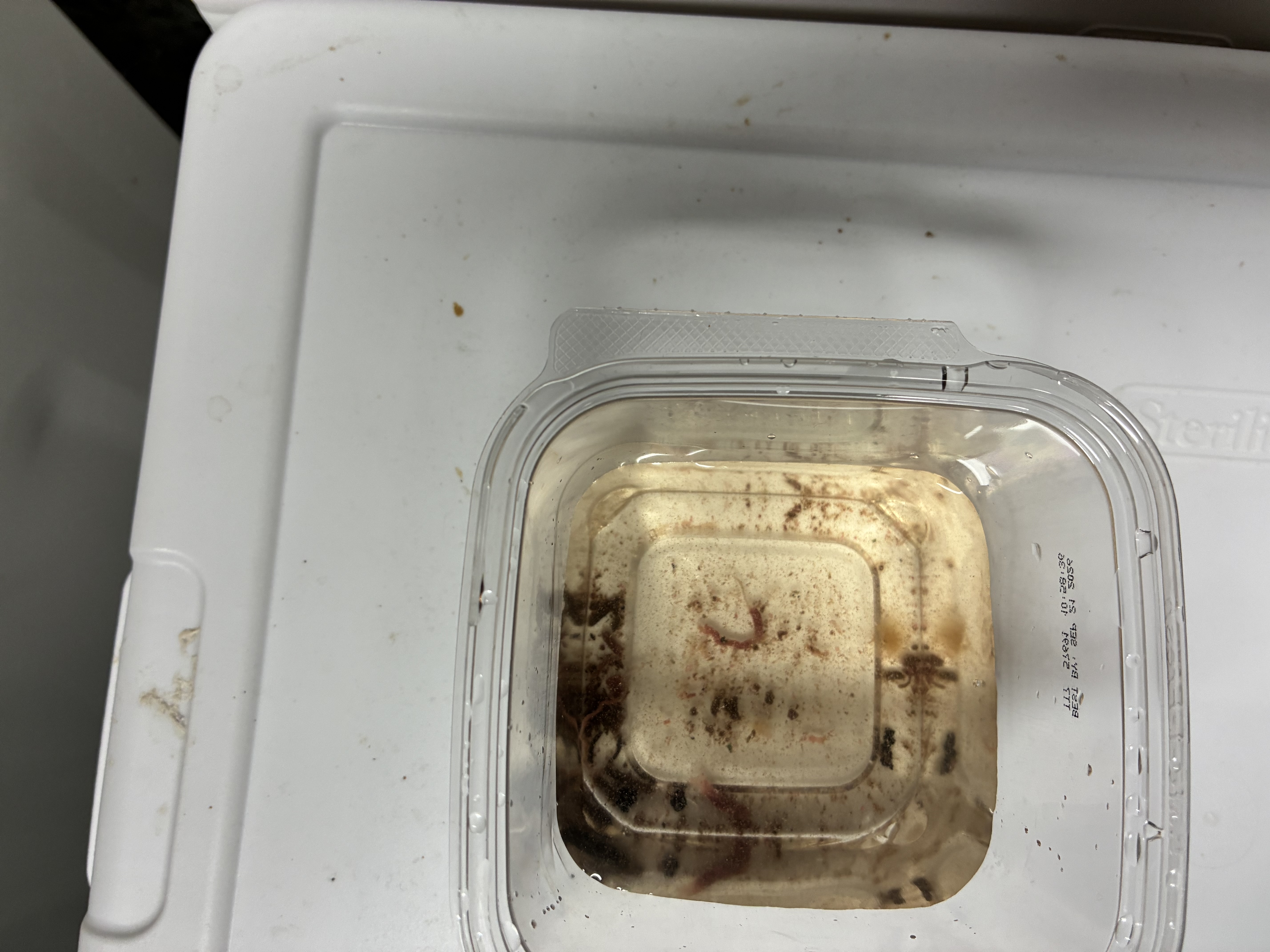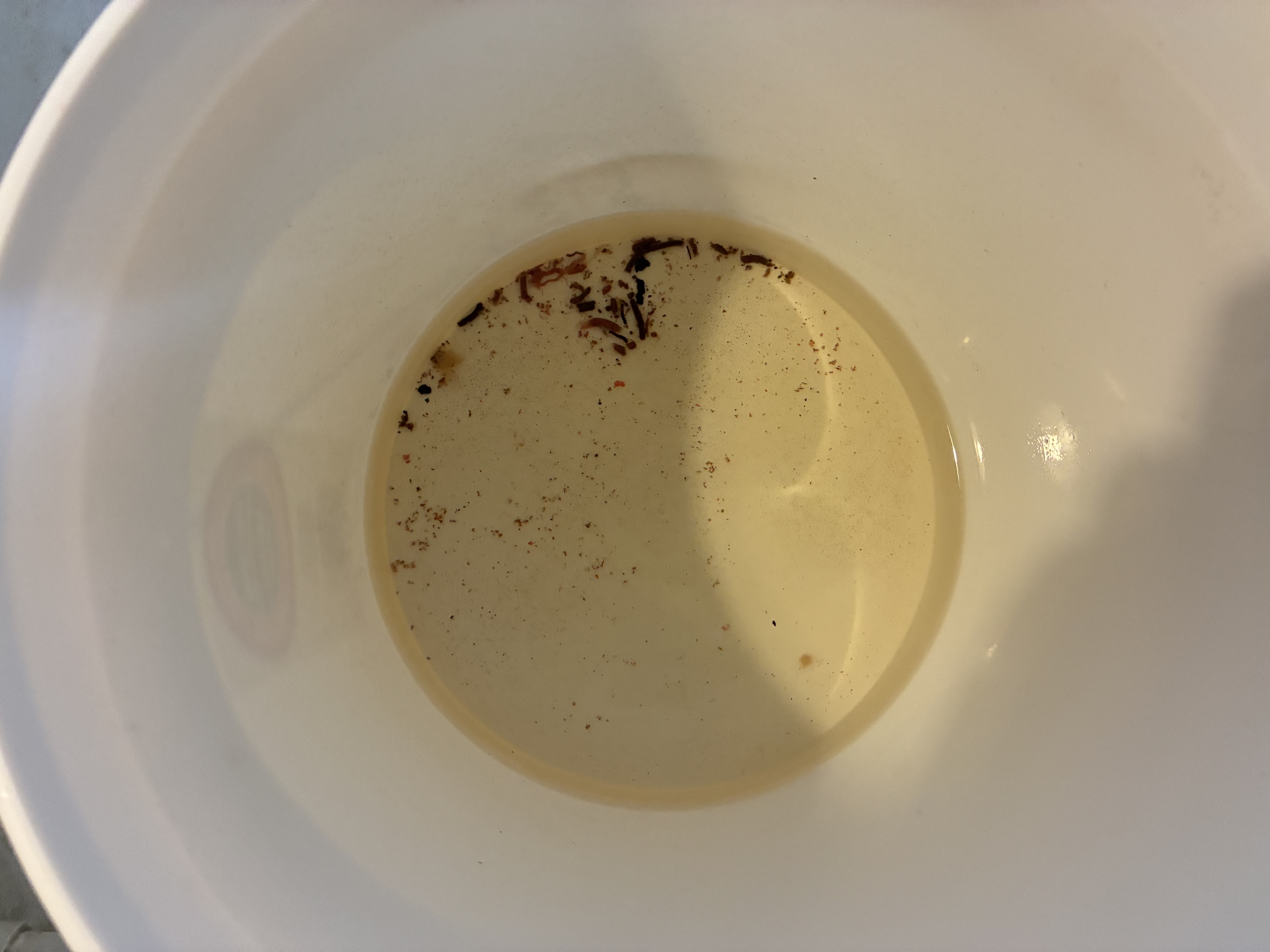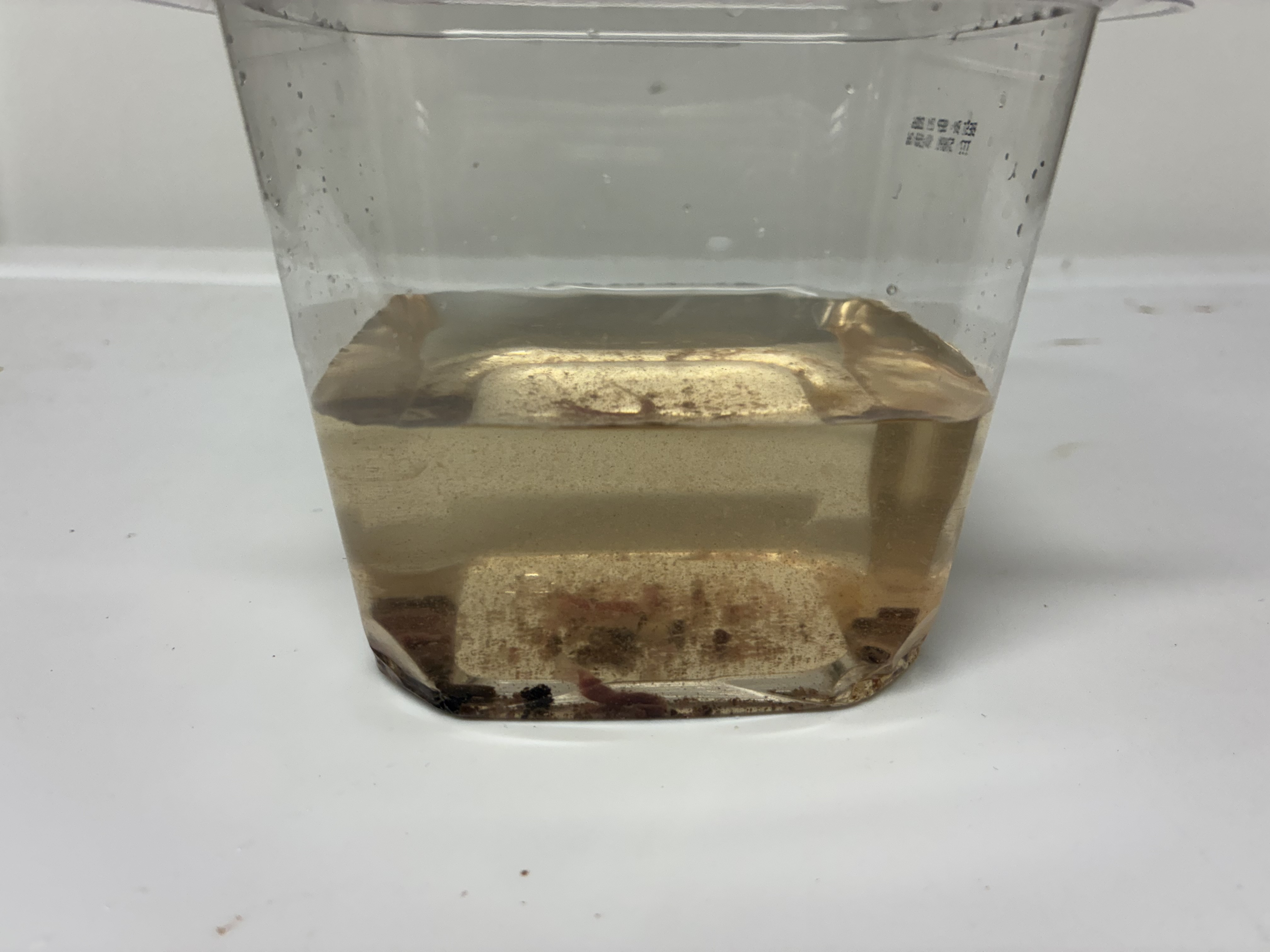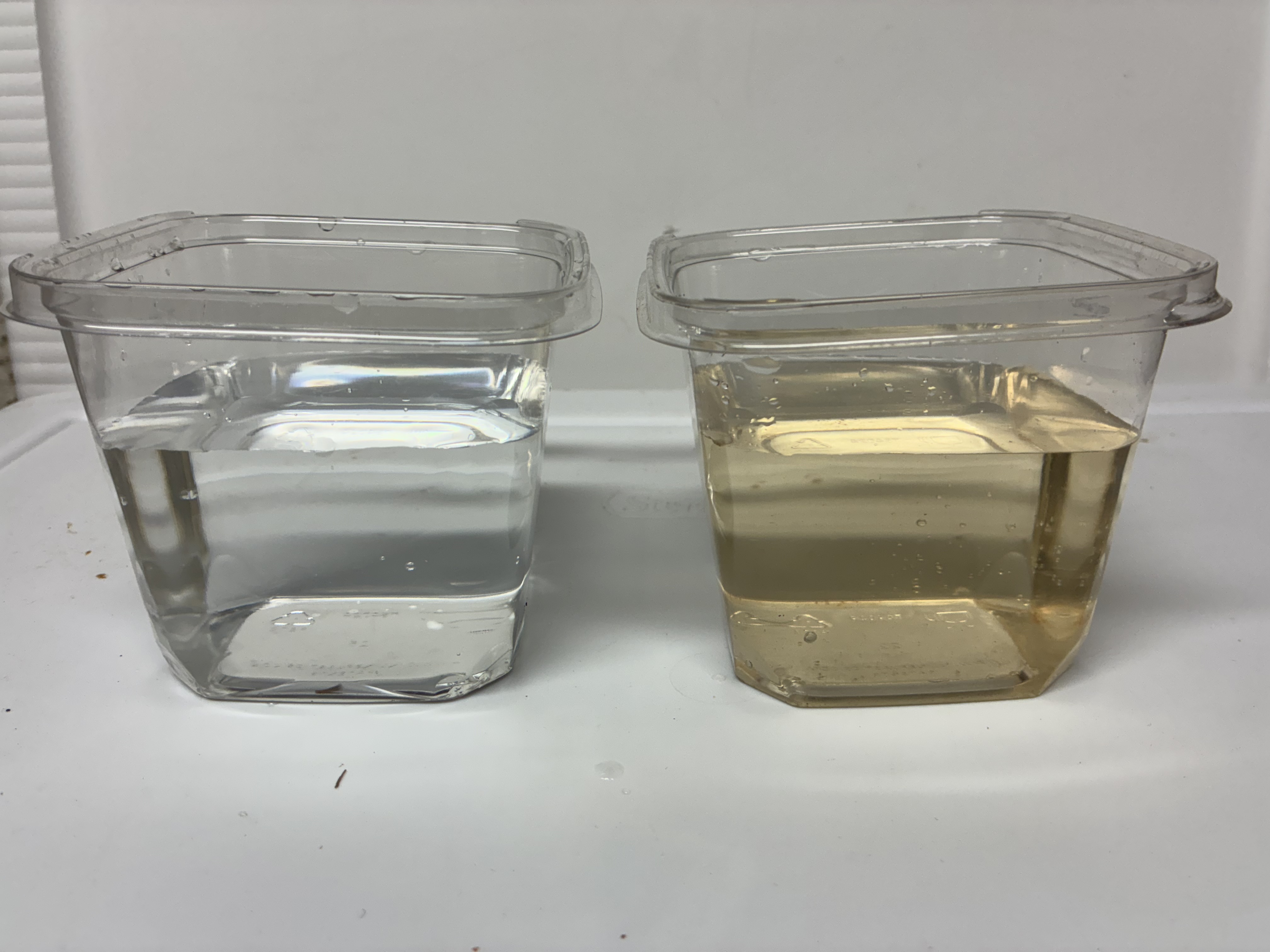 The collected solids and remaining water is transferred into the perched 5 gallon pail. Here are two more views of these settled solids and wastes and a comparison with tap water and the decant water in the last photo