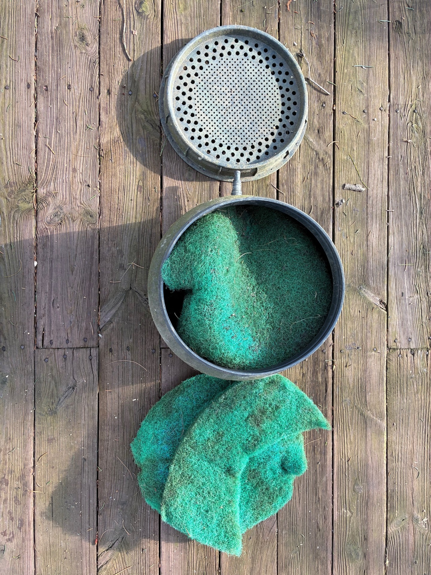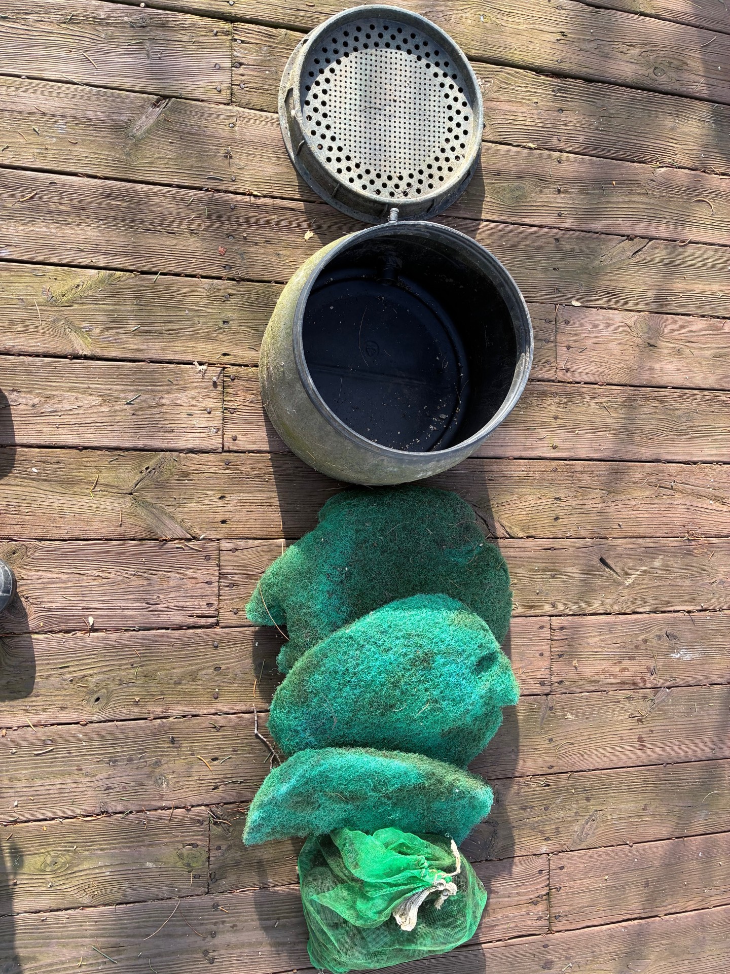 Pond water enters the biofilter through the holes in the top, passes through the plastic media, and exits the biofiter through an outlet at the bottom of the filter. This is connected to the recycle pump which pumps the filtered water up to the birdbath fountain. An extensive microbial biomass grows on and in the plastic media and this also traps the suspended solids in the influent water.