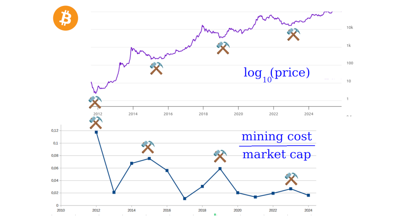 | year | tW-hr per year | bitcoins created per year | mW-hr per bitcoin | exa-hash per year | hash per W-hr | US electricity $ per kW-hr | market cap billion $ | $ billion cost per year | energy cost over cap | tera-hash per block |