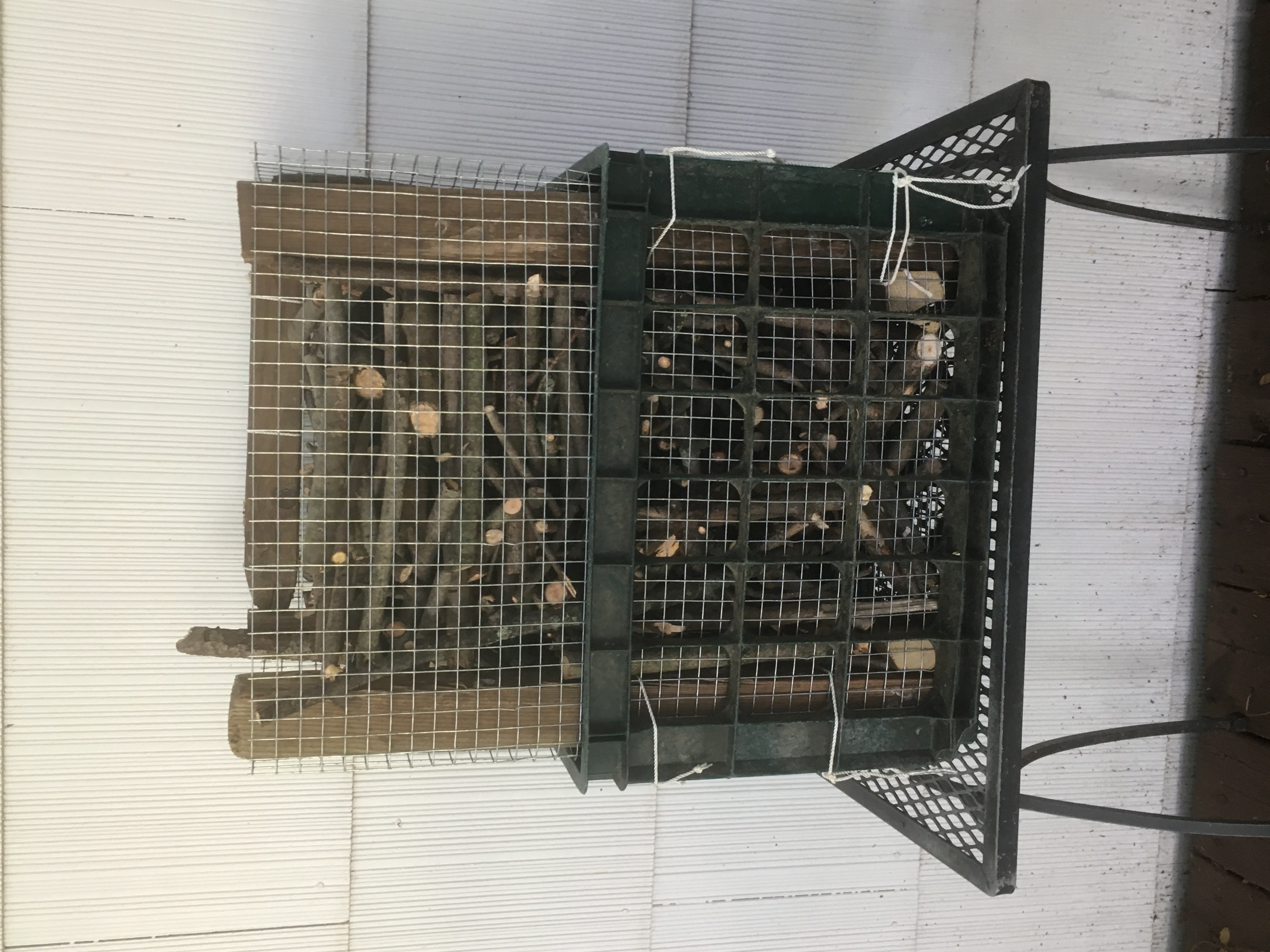 In the summer of 2025 the backyard pond was converted into a second generation TimberFish ecotechnology system. The biofilter was replaced with a bundle of dead sticks from 30 to 36 inches long that were collected from the sugar and red maple trees on the property. A second biofilter containing shorter sticks was constructed from hardware cloth that fitted into a black four gallon milk crate. Here are photos of these two systems.